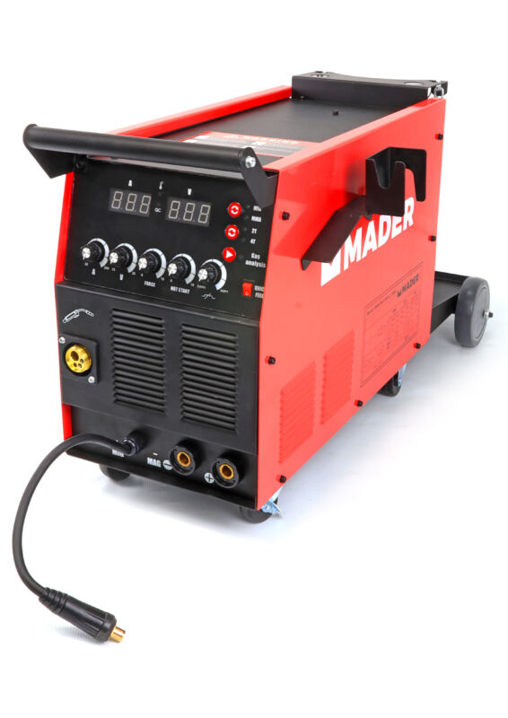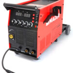 Máquina de soldar com funções MMA (elétrodos), MIG/MAG (fio fluxado) e MIG/MAG (fio com gás). Inclui compensação automática de corrente (Arc Force) e função Anti Stick para evitar a colagem do elétrodo.